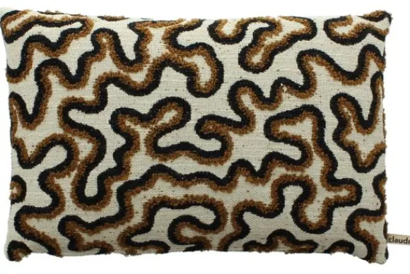 Sierkussen Sligga Copper van het merk Claudi is een sierlijke toevoeging aan de ruimte. Het speelse patroon van kronkelende lijnen met warme koper sluiten goed aan bij een Japandi of modern landelijk interieur.