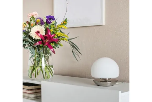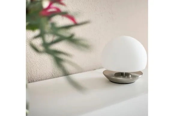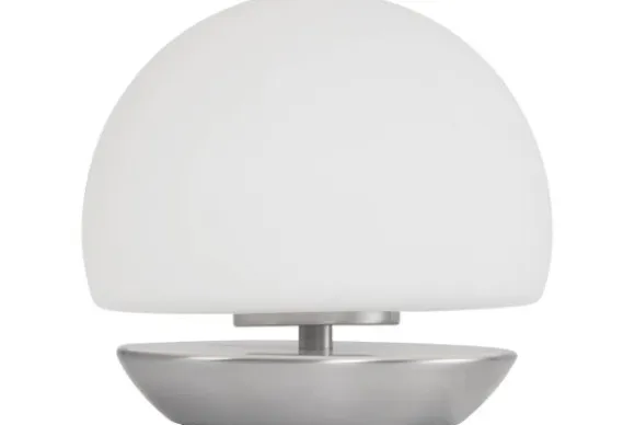 Tafellamp Ancilla van het merk Steinhauer is een verfijnde tafellamp van wit glas met een zilverkleurige voet. In de voet is een touch dimmer geïntegreerd waarmee u eenvoudig schakelt tussen vier lichtstanden.