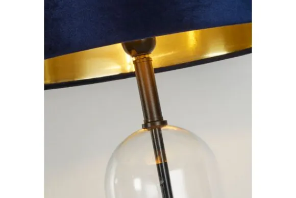 Tafellamp Oxford EU81711AZ van het merk Searchlight is een luxueuze lamp met een zwart voetstuk van marmer dat in een glazen stolp zit. De lampenkap is van donkerblauw velvet, de binnenkant is goud gekleurd voor een elegant effect.