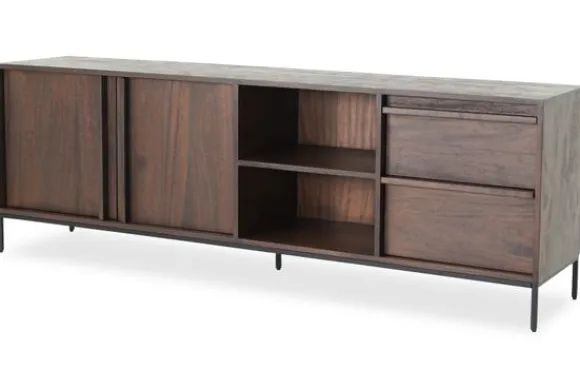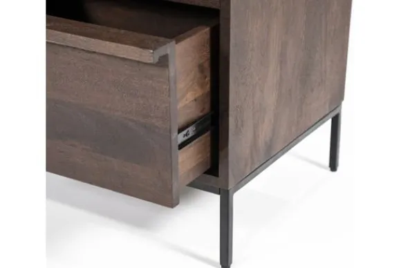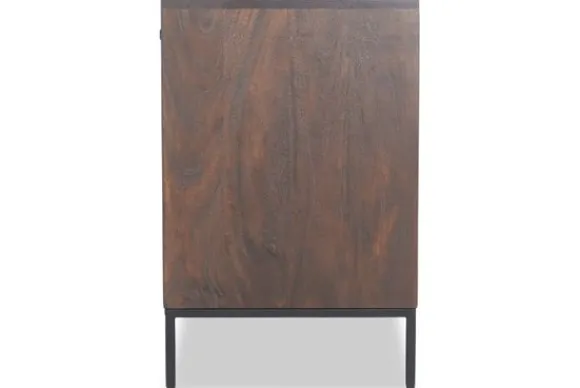 Het tv-meubel is gemaakt van mangohout in combinatie met een metalen onderstel. Mangohout heeft zichtbare kleurschakeringen en natuurlijke verschillen in het houtoppervlak. De houttinten lopen uiteen van licht tot donker.