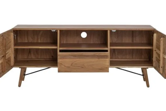 Tv-meubel Aura VF 0010 van het merk Tower Living in de kleur naturel is vervaardigd uit acaciahout. Deze duurzame en harde houtsoort staat bekend om zijn lange levensduur en warme uitstraling. De nerftekeningen maken elk meubel uniek en voegt direct sfeer toe aan de woonkamer.