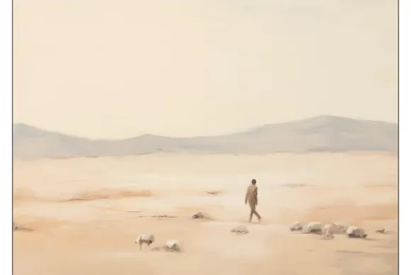 Wandkleed Shepherd Horizontaal van het merk Urban Cotton is ontworpen door Urban Cotton en toont een artistieke weergave van een persoon in een woestijnlandschap. Het wandkleed wordt afgedrukt op stof van 100% katoen, wat ieder kunstwerk een rijke uitstraling en matte look geeft.