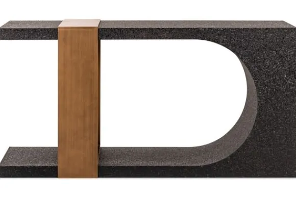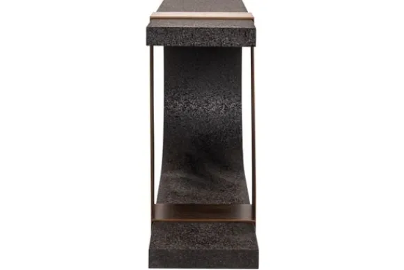 Wandtafel Bazel 213497 van het merk Richmond Interiors is een krachtig statementstuk met een uitgesproken design. De wandtafel combineert een diepzwarte, ruwe steentextuur met een bronzen middenaccent dat als een strakke band over het blad en de poot vouwt. De afgeronde uitsparing in de poot zorgt voor een speels lijnenspel, alsof het licht zelf door de vorm wordt geleid.