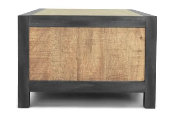 De metalen handgrepen en grijze melamine zijkanten met metaallook versterken het robuuste karakter van de tafel. De warme houtstructuur gecombineerd met metaal past goed in moderne en industriële woonstijlen.