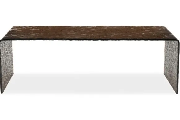 De organische structuur van het glas geeft een dynamisch spel van licht en schaduw, terwijl de slanke, rechthoekige vorm een moderne en minimalistische uitstraling behoudt. Dit contrast tussen ruwe textuur en strak design maakt de tafel tot een ware blikvanger.