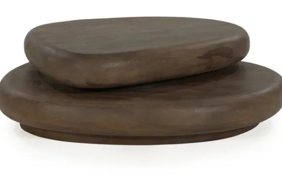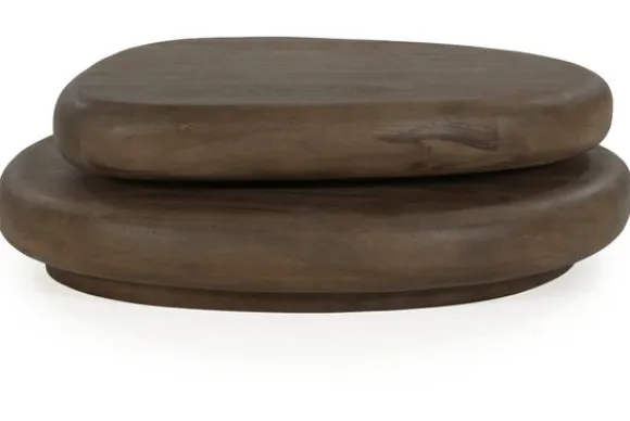 Gemaakt van massief mangohout in een diepe, warme bruine tint, bestaat deze tafel uit twee afgeronde, onregelmatig gevormde bladen die boven elkaar lijken te zweven. De zachte lijnen en ronde vormen zorgen voor een uitnodigende uitstraling en brengen een vloeiende dynamiek in je interieur.