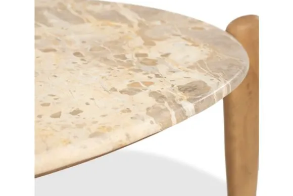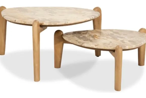 De combinatie van het gladde mangohout en het gepolijste marmer geeft de tafels een speelse uitstraling.
