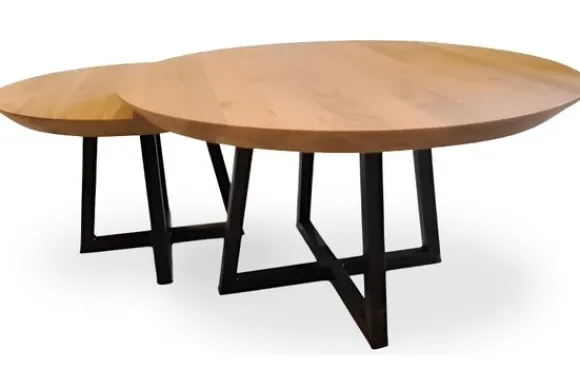 Het tafelblad heeft een ronde vorm en is afgewerkt met een tapse rand. Het blad is 4 cm dik. Onder deze salontafel zitten zwarte metalen poten. De kleine salontafel heeft een diameter van 60 cm en de grote salontafel heeft een diameter van 80 cm.