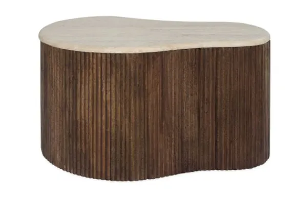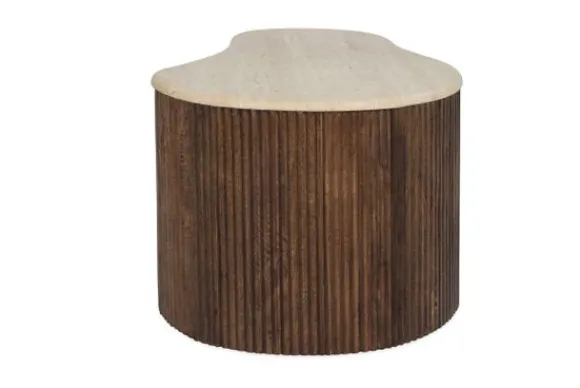 De basis van de tafel is gemaakt van mango hout, bekend om zijn duurzaamheid en mooie, warme uitstraling. Het hout is verticaal geribbeld, wat zorgt voor een mooie textuur en een speelse interactie tussen het strakke travertin en het natuurlijke hout. Deze tafel is perfect voor liefhebbers van natuurlijke materialen en organische vormen, en zal zeker een blikvanger zijn in elke woonkamer.