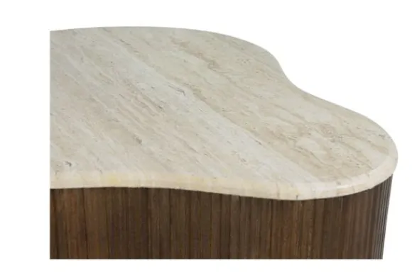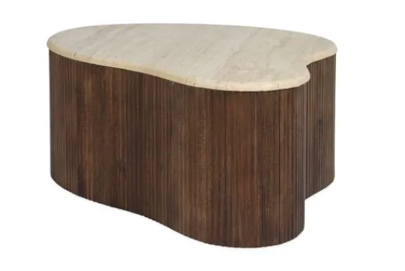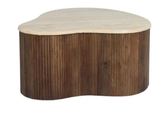 De basis van de tafel is gemaakt van mango hout, bekend om zijn duurzaamheid en mooie, warme uitstraling. Het hout is verticaal geribbeld, wat zorgt voor een mooie textuur en een speelse interactie tussen het strakke travertin en het natuurlijke hout. Deze tafel is perfect voor liefhebbers van natuurlijke materialen en organische vormen, en zal zeker een blikvanger zijn in elke woonkamer.