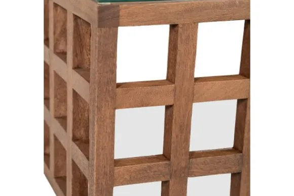 Salontafel Heras 96575 van het merk Eleonora is uitgevoerd in mangohout met een vierkant glazen blad. De open structuur bestaat uit een strak raster van houten vakken. Het glazen blad ligt boven op het frame en heeft een transparante afwerking. De warme houtkleur laat een natuurlijke nerf zien.