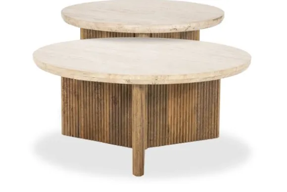 Salontafelset Sara is van het merk Eleonora. Deze set bestaat uit twee tafels met de volgende afmetingen: B88 x D88 x H35 cm en B60 x D60 x H40 cm. Het tafelblad is gemaakt van travertin. Travertin is een mooi en duurzaam natuurlijk sedimentair gesteente, gemaakt van calciumcarbonaat, dat vaak gebruikt wordt voor tafelbladen. Het heeft een unieke uitstraling met variaties in kleur en textuur. Hoewel het redelijk stevig is, kan travertin gemakkelijk krassen oplossen van scherpe voorwerpen of zware impact. Voor een lange levensduur van het blad adviseren wij ook altijd bescherming te gebruiken.