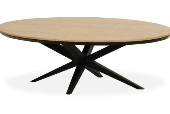 Salontafel Levin van het merk Lamulux, hier afgebeeld in de kleur fresh oak, is beschikbaar in diverse vormen en kleuren. De tafel is voorzien van een zwart metalen onderstel. De tafel heeft een ovale vorm met een tapse rand.