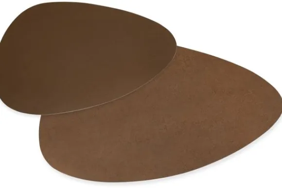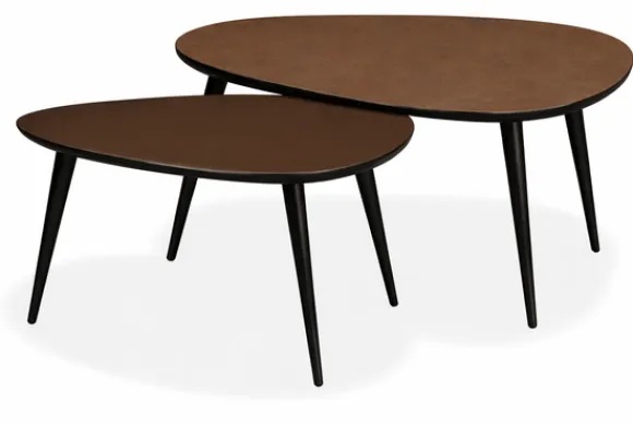 Salontafelset Madoka van het merk Lamulux bestaat uit 2 strakke tafels met de afmetingen B86 x D67 x H50 cm en B71 x D52 x H43 cm. De organische salontafels hebben een zwarte metalen onderstel met een koperkleurig tafelblad met verschillende texturen.