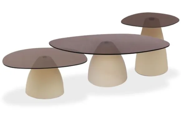 Salontafelset Mylon van het merk Brix is een unieke tafelset met een organische vorm. Het tafelblad is gemaakt van bruin glas. De tafelpoot is van beton gemaakt. Beton is een duurzaam en veelzijdig materiaal. Deze tafel is makkelijk schoon te maken met een zachte, vochtige doek. Deze set bestaat uit drie tafels met de volgende afmetingen: B76 x D86 x H35 cm, B110 x D65 x H35 cm en B43 x D50 x H40 cm.