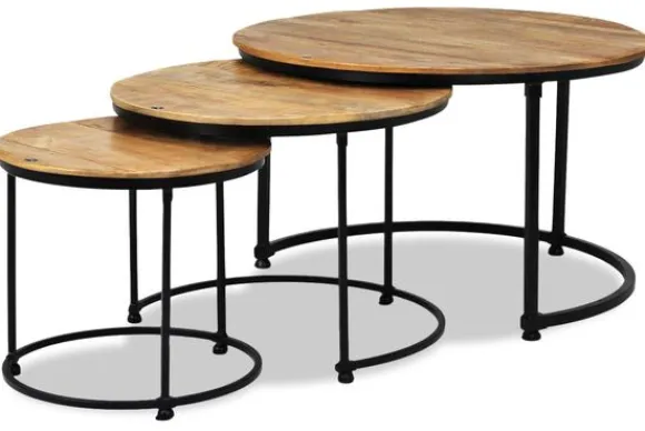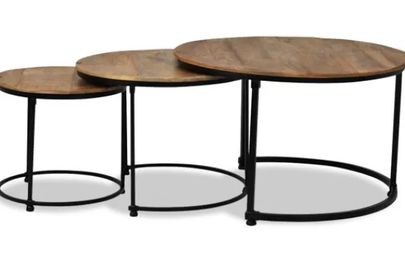 Salontafelset Esprezzo van het merk Old Wood is een set van drie unieke tafels. De tafels worden handgemaakt, hierdoor is iedere tafel uniek en anders qua kleur en afwerking. De tafels zijn volledig in elkaar te schuiven. De tafels hebben een zwart ijzeren onderstel .