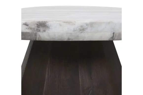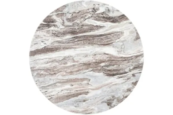 De ronde tafel combineert een robuuste conische poot van mangohout met een verfijnd blad van echt marmer. Mangohout kun je herkennen aan de vele kleurschakeringen en natuurlijke oneffenheden, van warme donkerbruine tonen tot een subtiele rode of gelige gloed. Hierdoor is elk exemplaar uniek en bovendien duurzaam.