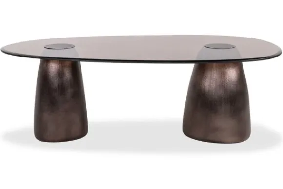 De tafel staat op twee aluminium middenpoten met een warme bronzen kleur. De organische vorm geeft een unieke touch aan je woonkamer.