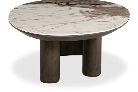 Het donkere eikenhouten onderstel zorgt voor een mooi evenwicht met het lichte keramieken blad.