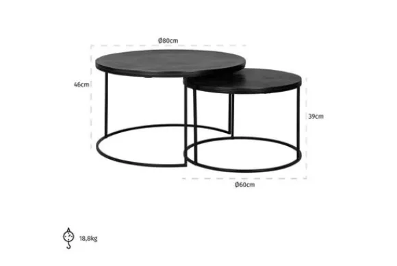 De kleinere tafel heeft de afmetingen (HxBxD): 40 x 60 x 60 cm. De hogere tafel heeft de afmetingen: 46 x 80 x 80 cm.