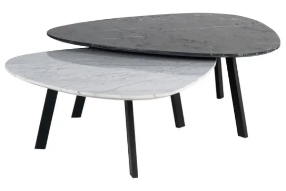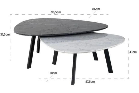Salontafelset Trocadero 211262 van het merk Richmond Interiors bestaat uit twee tafeltjes. De tafeltjes hebben een marmeren blad. Marmer is een duurzame steensoort en heeft een luxe en stijlvolle uitstraling. De steensoort is een natuurproduct en kenmerkt zich door de unieke afwerkingen en kan zowel grove als gladde delen bevatten. Door de kenmerkende kleurschakeringen en aders is geen product hetzelfde. Zo haal je met een marmer product dus echt iets unieks in huis. De hoge tafel heeft een afmeting van H37,5xB96,5xD86 cm en de kleine tafel heeft een afmeting van H33xB87,5×78 cm.