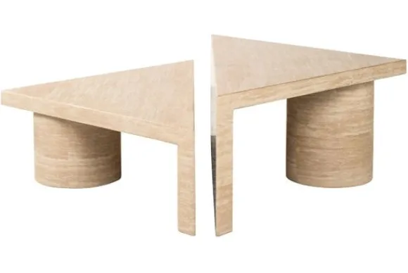 De speelse driehoekige vormen en robuuste poten geven de tafels een sculpturale uitstraling. Dankzij de zachte beige tint en natuursteen-effect voegen ze een warm en elegant accent toe aan je interieur.