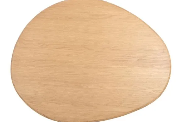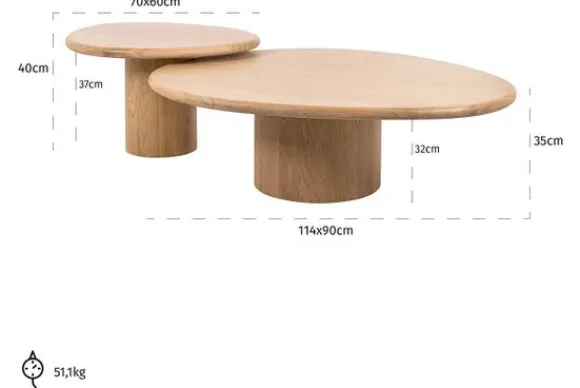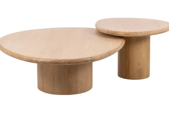 Salontafelset Oakley 212356 van het merk Richmond Interiors is vervaardigd uit eiken en eiken fineer. Fineer is een dun laagje hout dat op plaatmateriaal wordt aangebracht. Dit wordt geproduceerd door een stam in dunne laagjes te snijden, hierdoor wordt de stam optimaal benut en is er weinig zaagverlies. De salontafels zijn voorzien van een blad met een organische vorm. De grote, lage tafel heeft een afmeting van B114xD90xH35 cm en de kleine, hoge tafel heeft een afmeting van B70xD60xH40 cm. Beide tafels hebben een bladdikte van 3cm.