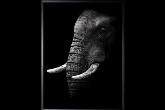 Art Print Olifant SHA414 van het merk Luxe Framing Art is verkrijgbaar in verschillende afmetingen. Op deze print zie je een olifantenkop in portret. De achtergrond is zwart, waardoor de verschillende grijstinten van het papier afspringen. Deze Art Print wordt standaard geleverd met een zwarte lijst.