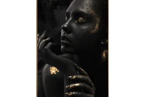 Schilderij Face CA-FACE van het merk Luxe Framing art is een kunstwerk op canvas. Canvas is een duurzame stof en heeft een prettige, matte uitstraling. Op dit schilderij is een vrouw afgebeeld, ze is zwart geschilderd en bedekt met gouden glitters. Dit schilderij wordt standaard geleverd met een gouden lijst.