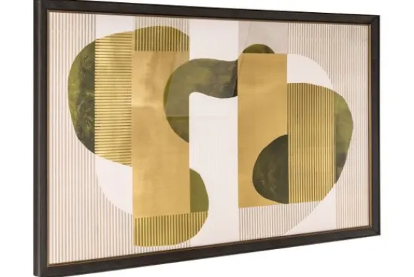 Het kunstwerk is gemaakt van leder en combineert geometrische vormen met rijke goud- en groentinten. De verticale lijnen zorgen voor een speels ritme dat het geheel extra diepte geeft.