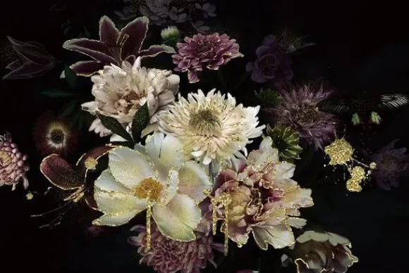 Glasschilderij Bloemen met Gouden Rand 080120-522 van het merk Ter Halle is 120 cm breed en 80 cm hoog. Op dit schilderij zie je witte en paarse bloemen op een zwarte achtergrond.