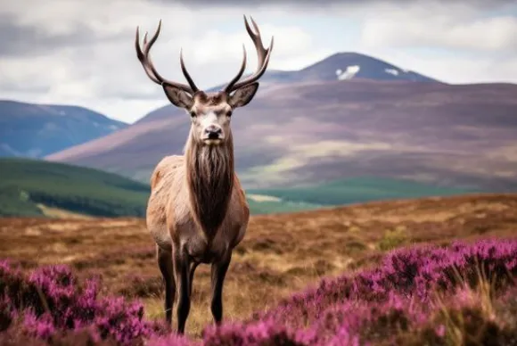 Glasschilderij Edelhert 080120-1092 van het merk Ter Halle toont een hert met een sierlijk gewei in een landschap met heide op de voorgrond en bergen op de achtergrond. De afbeelding bevat vele kleuren en zorgt voor een natuurlijke uitstraling binnen het interieur.