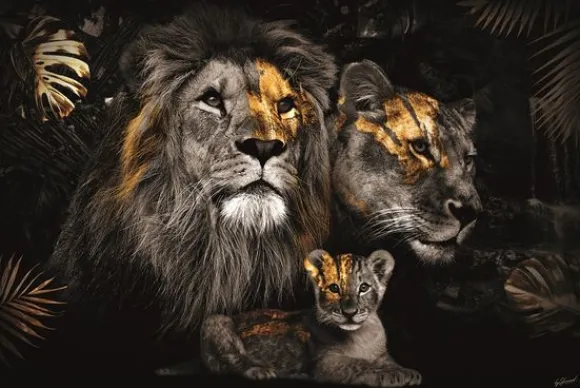 De jonge leeuw is schattig en speels, met dezelfde gouden accenten op zijn vacht als zijn ouders, wat symbool staat voor eenheid en continuïteit. De ogen van de welp zijn groot en nieuwsgierig, waardoor hij een jeugdigere uitstraling heeft in vergelijking met de volwassen leeuwen.