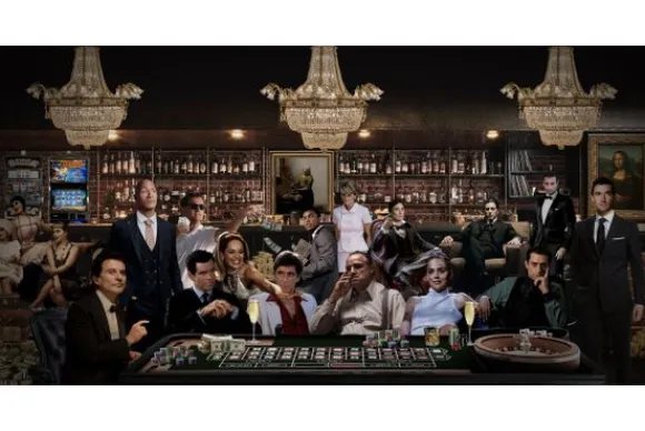 Glasschilderij Maffia roulette 080160-044 van het merk Ter Halle toont een filmisch tafereel in een luxe casino. In de scène gebeurt veel en zijn acteurs uit verschillende films en series te zien.