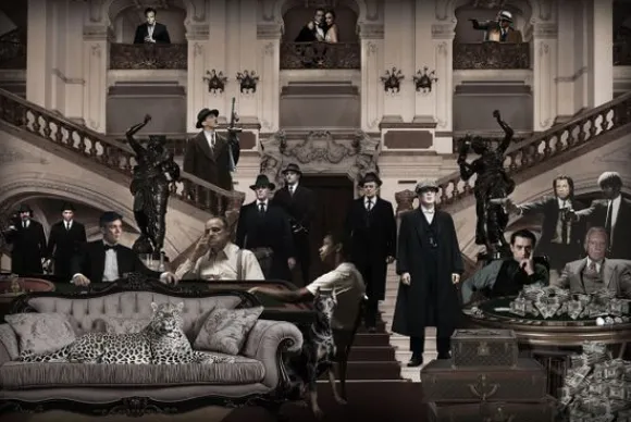 Glasschilderij Mafia Zwart Wit van het merk Ter Halle toont een luxe en dramatische scène die doet denken aan een filmisch tafereel in maffia-stijl. Het kunstwerk is rijk aan details en speelt zich af in een statig herenhuis.