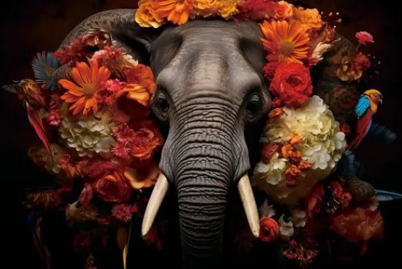 Schilderijen-Ter Halle Glasschilderij Olifant met Bloemen en Vogels 110160-200