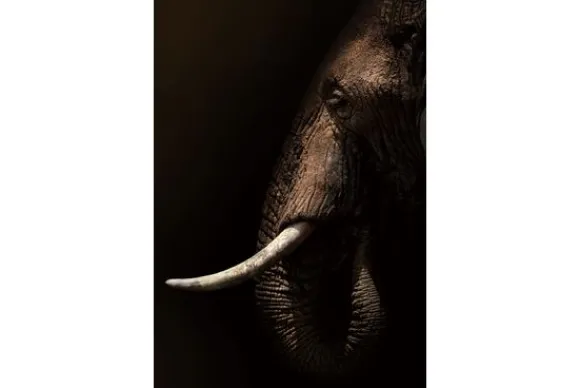 Glasschilderij Olifant mysterieus 080120-1109 van het merk Ter Halle toont een zijaanzicht van een olifant. De zwarte achtergrond en schaars belichte olifantenkop geven een luxe accent aan het beeld.
