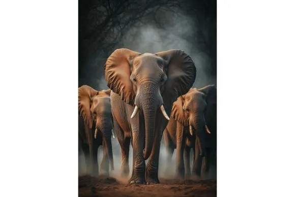 Glasschilderij Olifanten in het donker 080120-1151 van het merk Ter Halle toont een groep olifanten. De donkere achtergrond geeft het beeld een onheilspellend effect.