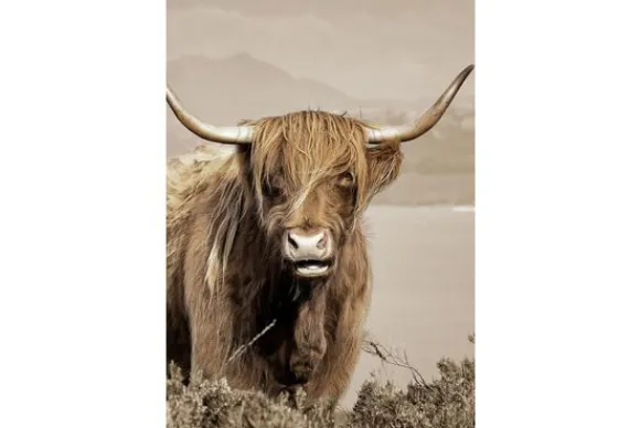 Glasschilderij Schotse hooglander links 110160-117 van het merk Ter Halle toont een Schotse hooglander. De chroomachtige filter geeft een mooi effect en zorgt dat het natuurlijke beeld goed past in landelijke en Scandinavische interieurs.