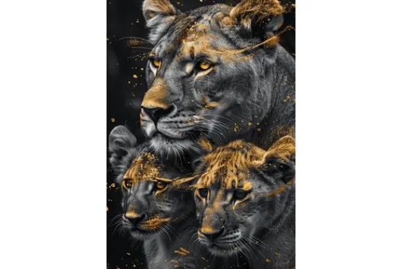 Glasschilderij Tijgers met gouden tinten 080120BS-664 van het merk Ter Halle is een zwart-wit een portret van een leeuw. De gouden markeringen geven een artistiek gevoel en past goed bij luxe en moderne interieurs.