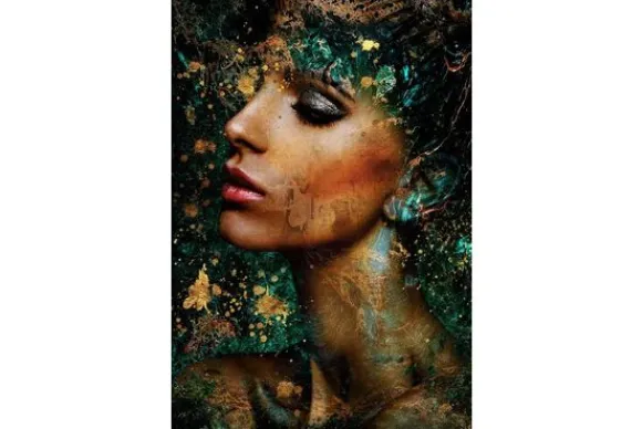 Glasschilderij Vrouw met goud-groene verf 080120-859 van het merk Ter Halle toont het zijaanzicht van een vrouw. De gouden en groen-blauwe verfspetters geven een artistiek en speels effect.