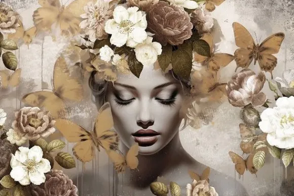 Glasschilderij Vrouw met Gouden Vlinders 080120-1033 van het merk Ter Halle is een dromerig kunstwerk waarin een serene vrouw en sierlijke vlinders samen een poëtisch beeld creëren.