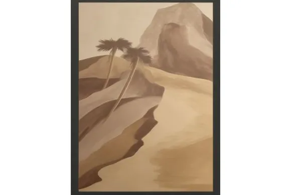 Art Print Rocky Palm van het merk Urban Cotton toont een sereen woestijnlandschap met zachtglooiende duinen, ruige rotsformaties en twee elegante palmbomen die afsteken tegen het licht. De warme aardetinten en zachte penseelstreken creëren een tijdloos tafereel dat uitnodigt tot rust en contemplatie.