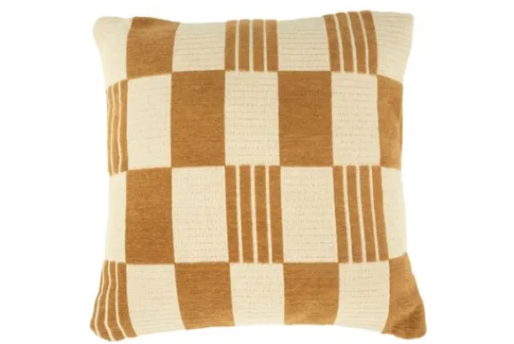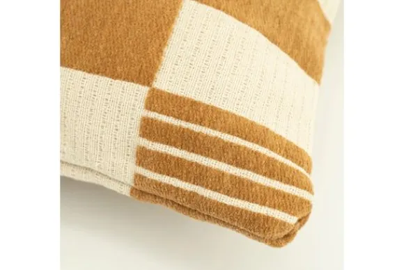 Sierkussen Twist 250097 mustard is 45 bij 45 cm en is beschikbaar in vier verschillende kleuren. Het dynamische schaakbordpatroon, afgewisseld met speelse lijnen, in een tijdloze combinatie van geel en crème, maakt dit kussen een stijlvolle blikvanger in elke ruimte.