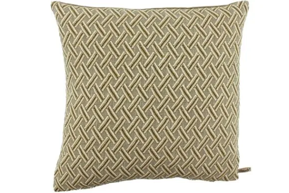 Het kussen is vervaardigd van een duurzame, ecovriendelijke stof en toont een elegant grafisch patroon dat doet denken aan een gevlochten mandwerk. De kleurcombinatie van camel, zand en zachte crème creëert een harmonieuze diepte en geeft het ontwerp een natuurlijke warmte. Door de subtiele glans en het voelbare reliëf ontstaat een luxe uitstraling met een ambachtelijk karakter.