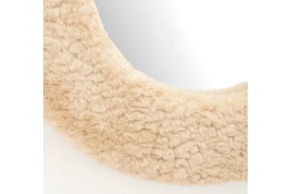 De spiegel heeft een unieke omlijsting van teddy-achtig textiel dat niet alleen comfortabel oogt, maar ook een gezellige sfeer creëert.