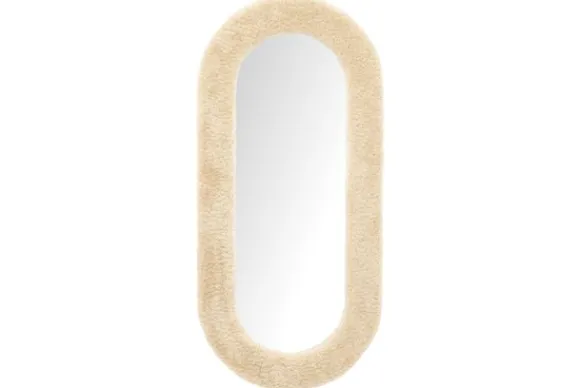 De spiegel heeft een unieke omlijsting van teddy-achtig textiel dat niet alleen comfortabel oogt, maar ook een gezellige sfeer creëert.