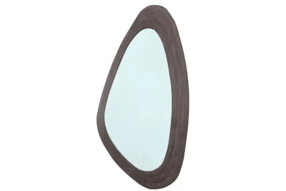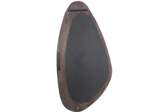 Spiegel Santin van het merk PTMD toont een organische, asymmetrische vorm met een donkere houten omlijsting.