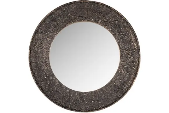 Spiegel Jamel 214028 van het merk Richmond Interiors is een ronde spiegel met een opvallende randstructuur. De brede omlijsting heeft een ruwe afwerking met een donkere basis en subtiele goudkleurige accenten.