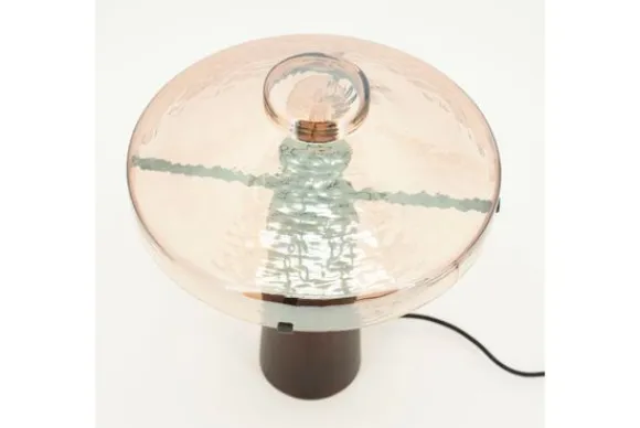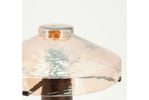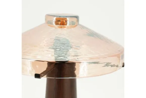 De basis, vervaardigd uit donker hout, heeft een zachte conische vorm met subtiele nerven die een natuurlijke diepte aan het ontwerp geven. Daarboven troont een elegante, met de hand gevormde glazen kap in een zachte roze tint, die op speelse wijze het licht breekt. De gehamerde structuur in het glas zorgt voor een levendig schaduwspel, alsof het licht van binnenuit danst.